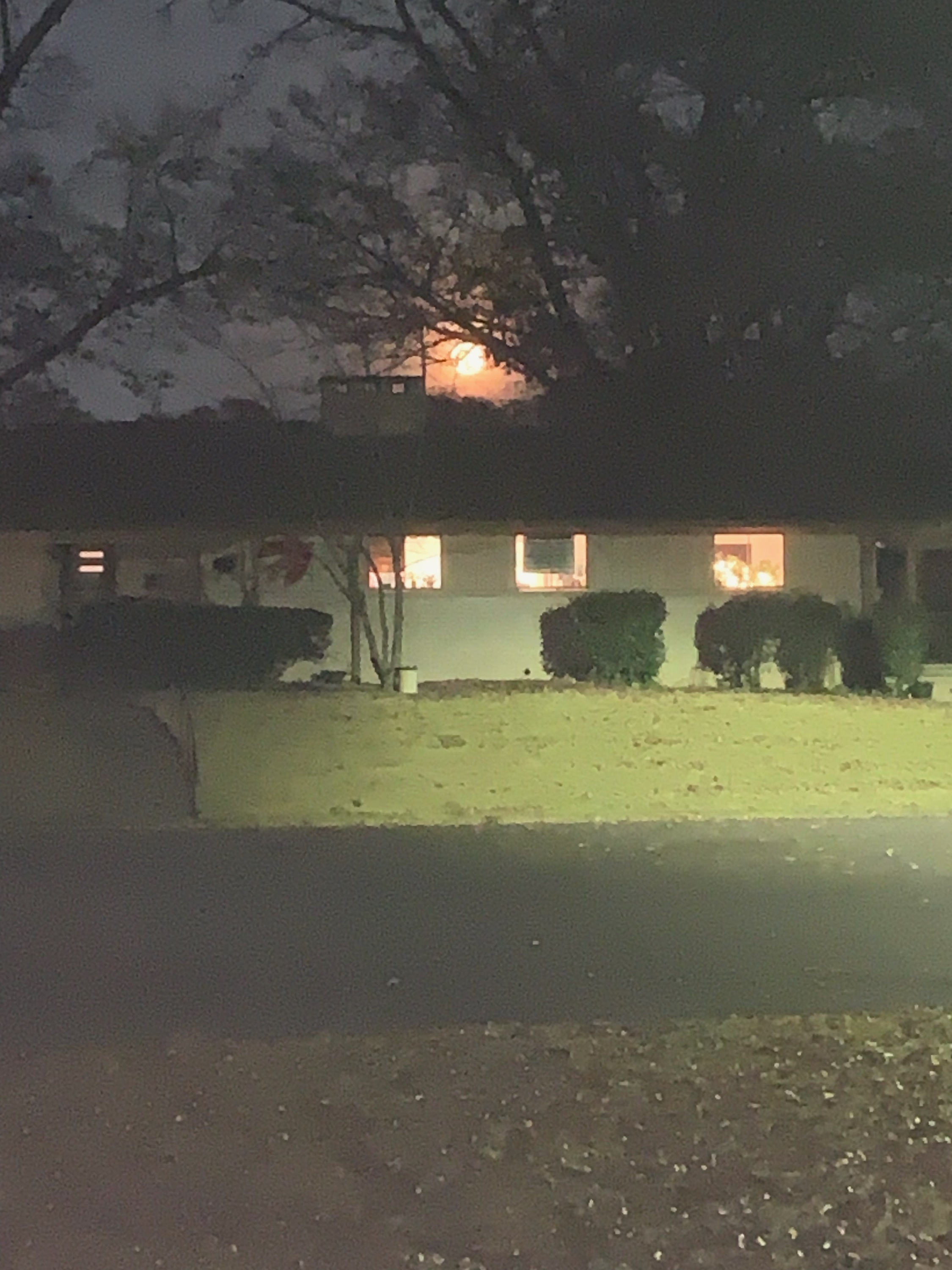 a photo of my house with a huge red moon rising behind it. I went outside and